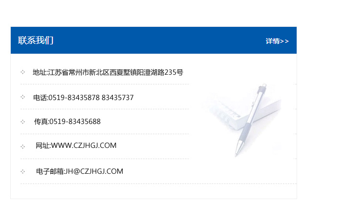 地址:常州市新北區友邦商務大廈1幢16、17層  電話:0519-85101652  傳真:0519-85112595  郵編:213022  網址:www.cz-jiayue_cn.naigugd.com  郵箱:xiajifengaa@163.com